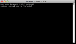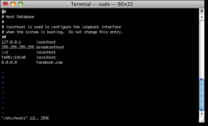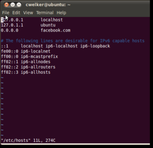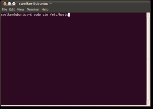 In Ubuntu 10.04 and most Linux distro’s, you can edit the host’s file directly in the terminal. You can use your favorite editor or even open your favorite GUI text editor. For this example, we will use VIM. Like Windows 7, Ubuntu’s host’s file is located in the /etc/ folder, though here it is in the root of the drive. In order to edit the file, you will need to open it as root which is why we use sudo here.